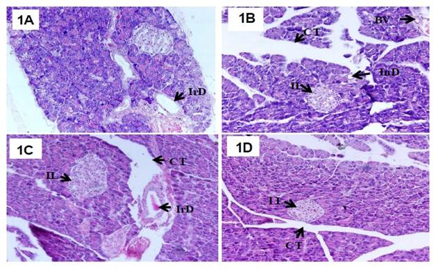 Fig. 1 Microscopic analysis by H & E (1A, 1B, 1C and 1D) staining of rat pancreatic tissue 5-week post oral administration of ELJ water extract. The rats were administrated with low dose (250 mg/kg bw) exhibited normal texture of pancreatic tissue (1A). The medium and high doses (500 mg & 1000 mg/kg, bw) treated groups showing no evidence of defect as well (1B & 1C). The pancreatic tissue structure in all groups appeared as normal as control (1D). There was no sign of degeneration, haemorrhage or fatty changes in all test groups. InD-intralobular duct IrD-inter lobular duct CT-connective tissue BV-blood vessel IL-islet of Langerhans. Original magnification×40.