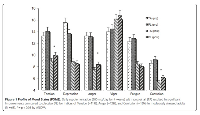 These results indicate that daily supplementation with tongkat ali root extract improves stress hormone profile and certain mood state parameters, suggesting that this “ancient” remedy may be an effective approach to shielding the body from the detrimental effects of “modern” chronic stress, which may include general day-to-day stress, as well as the stress of dieting, sleep deprivation, and exercise training.
