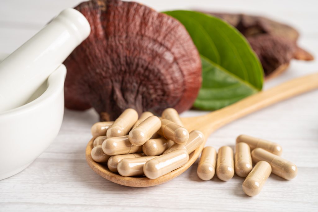 Dried lingzhi mushroom with capsule drug, alternative medicine herbal organic herb.